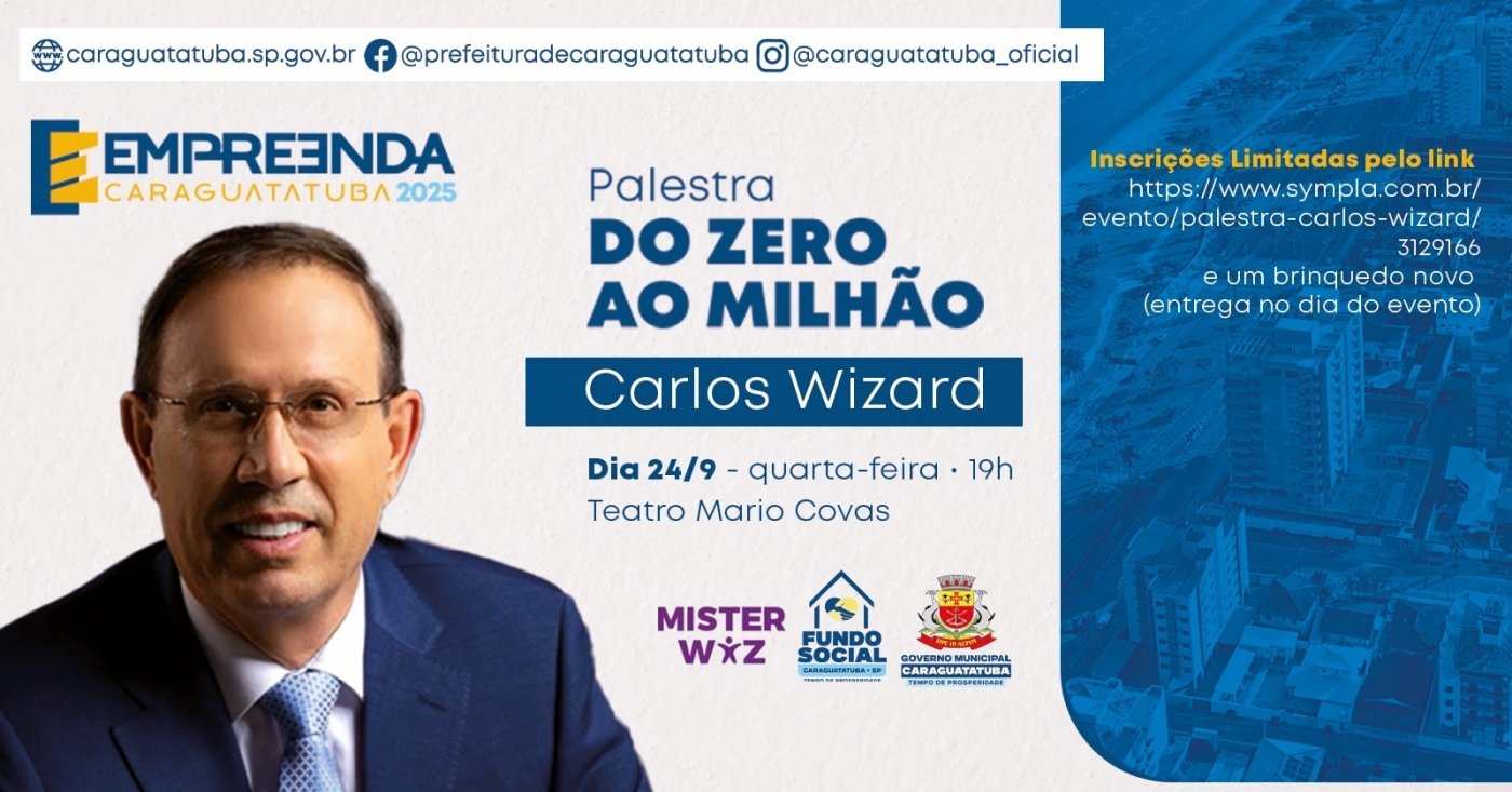 A entrada é solidária, mediante inscrição prévia pelo formulário on-line disponível no link https://www.sympla.com.br/evento/palestra-carlos-wizard/3129166 e a entrega de um brinquedo novo, no dia do evento, que será destinado ao Fundo Social de Caraguatatuba para o evento Rua das Crianças, que será realizado nos dias 11 e 18 de outubro.