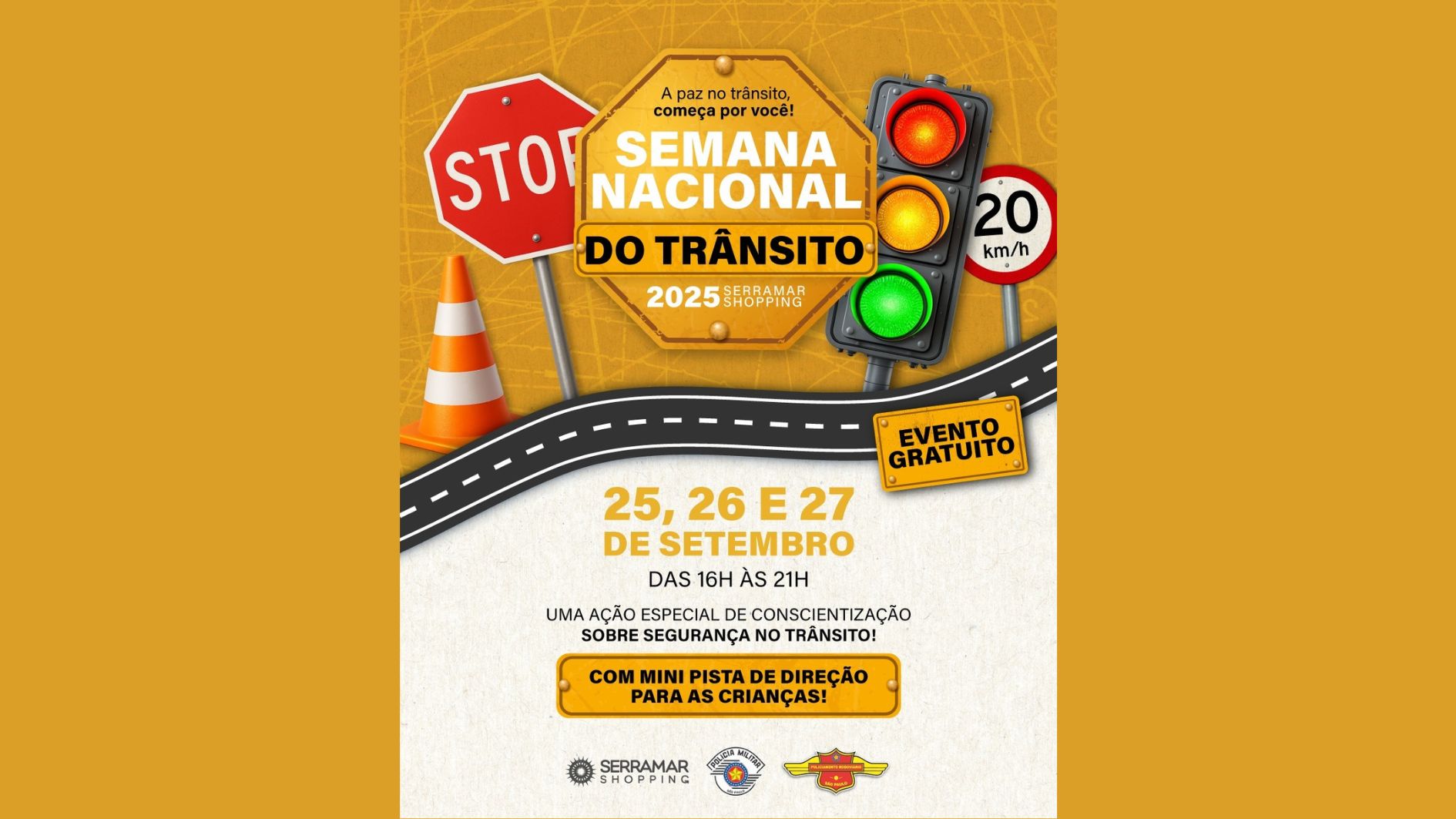 Com a proposta de promover a educação e a conscientização de motoristas, motociclistas, ciclistas e pedestres sobre comportamentos seguros no trânsito, o Serramar Shopping, será palco de uma série de atividades voltadas à valorização da vida no trânsito, entre os dias 25 e 27 de setembro, das 16h às 21h. A ação, que acontecerá na praça central de eventos, será em parceria com a Polícia Militar e a Polícia Rodoviária Estadual, como parte da programação da Semana de Proteção no Trânsito.